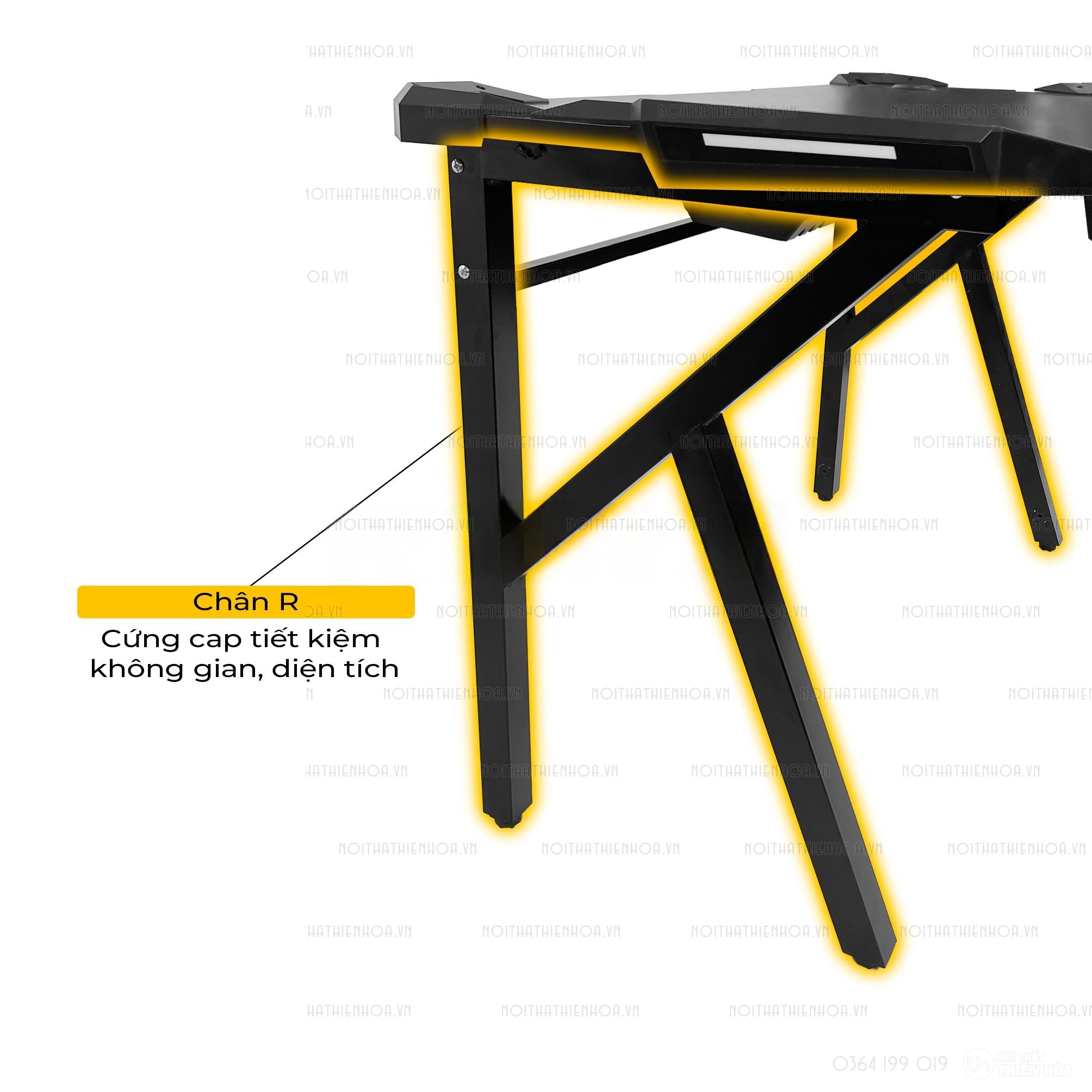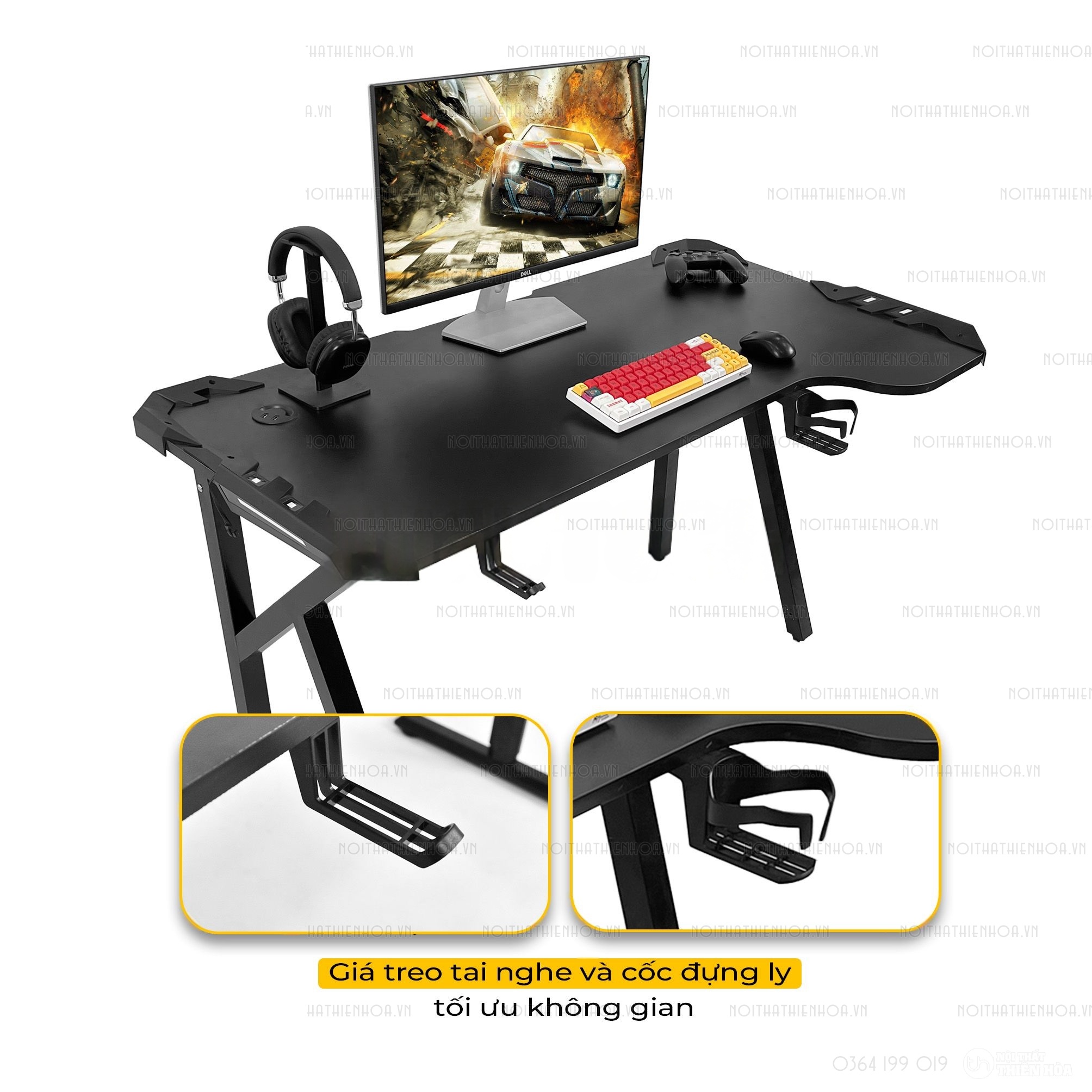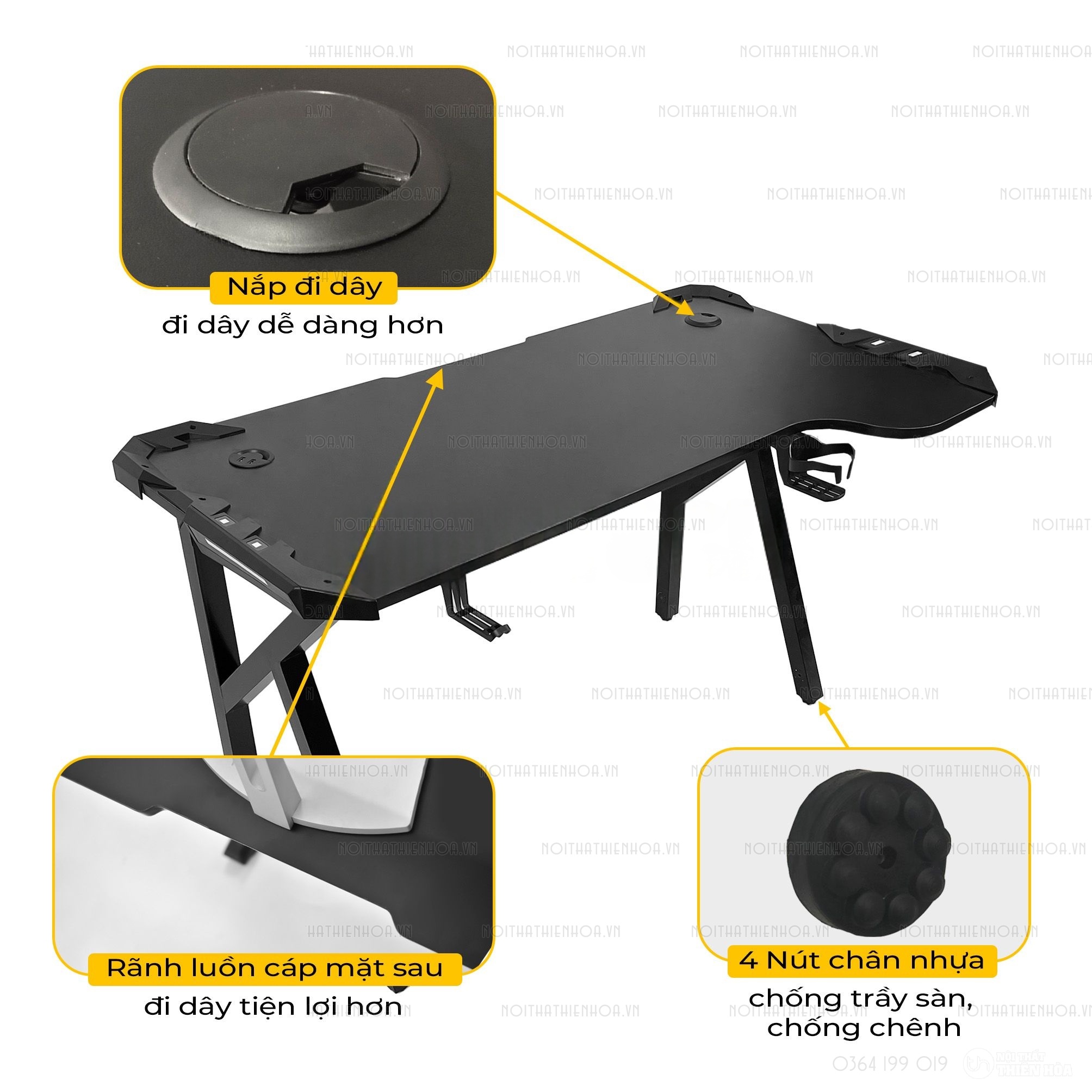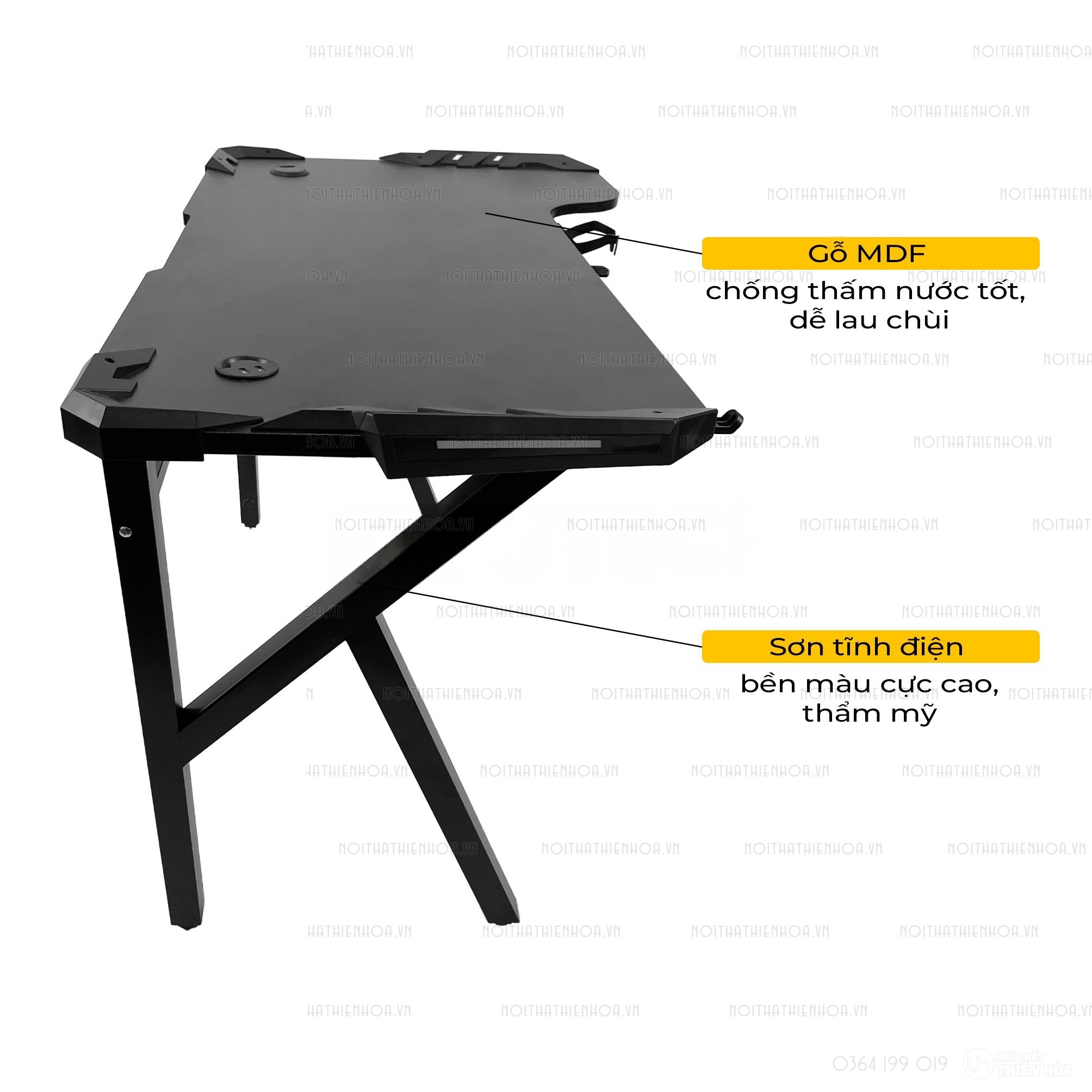 – Phần khung sắt chân bàn có độ dày 1.2 ly sơn tĩnh điện, mặt bàn có các lỗ đi dây, cổng USB hình tròn tiện lợi, đa năng giúp tối ưu hoá không gian chơi game.