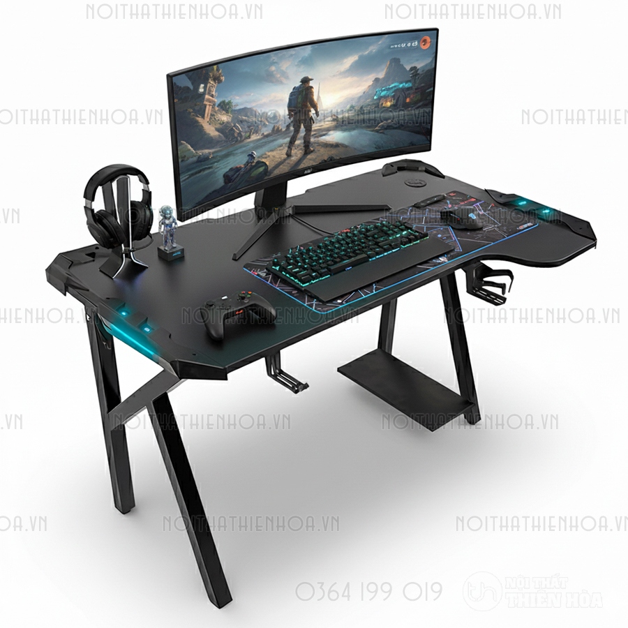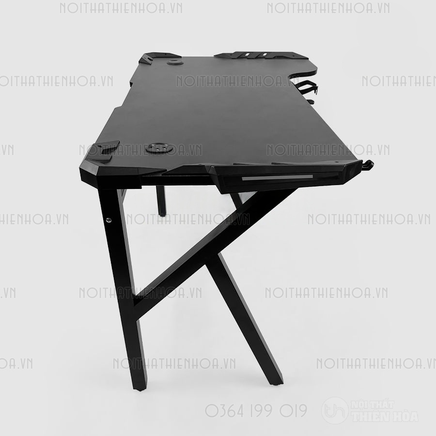 – Mặt bàn hình chữ nhật tạo góc khuyết cạnh, làm bằng gỗ MDF phủ melamine chống xước đảm bảo cho các gamer có tư thế ngồi thoải mái