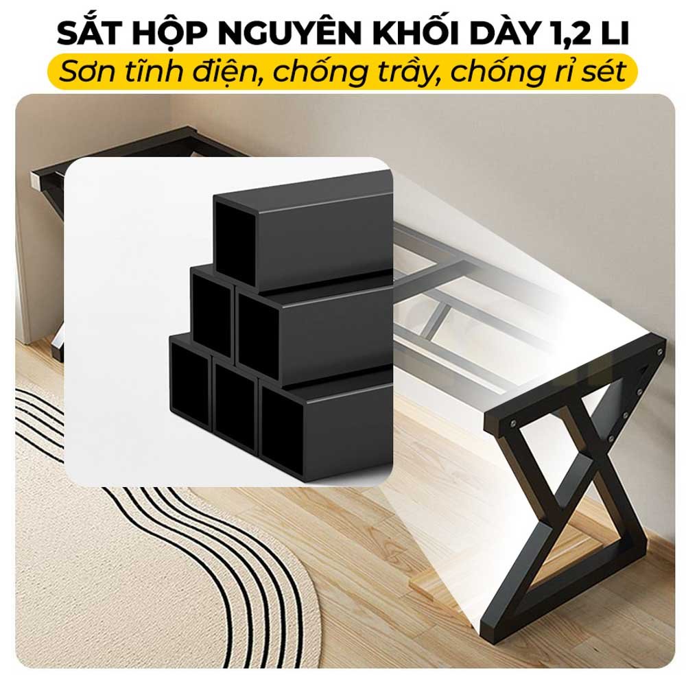 Chất liệu Khung sắt 4x4cm, dày 1.2 ly được sơn tĩnh điện, mặt bàn gỗ MDF cao cấp phủ Melamine.