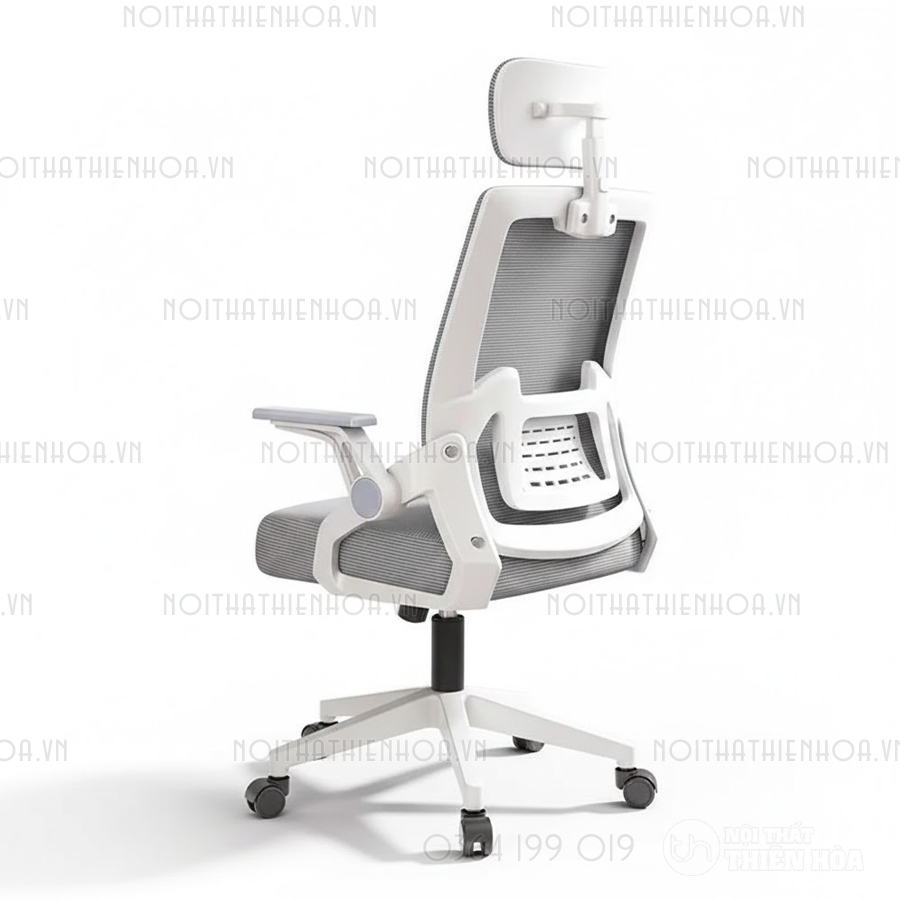 Ghế công thái học thiết kế lưng cao, tích hợp tựa đầu thư giãn, mang đến tư thế ngồi chuẩn, giảm áp lực cột sống, phù hợp văn phòng hiện đại và không gian làm việc tại nhà tiện nghi.