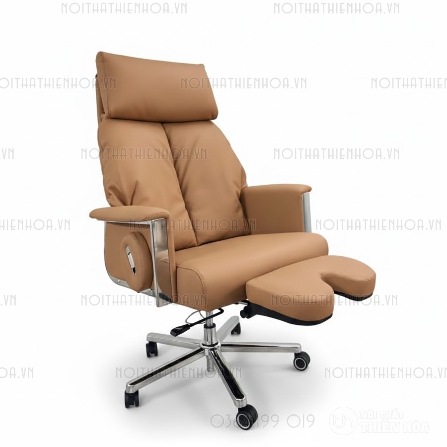 Ghế giám đốc thiết kế hiện đại, đệm mút dày êm ái nâng đỡ toàn thân, có gác chân dạng chữ U tiện lợi giúp thư giãn, phù hợp không gian lãnh đạo cần sự thoải mái và chuyên nghiệp.